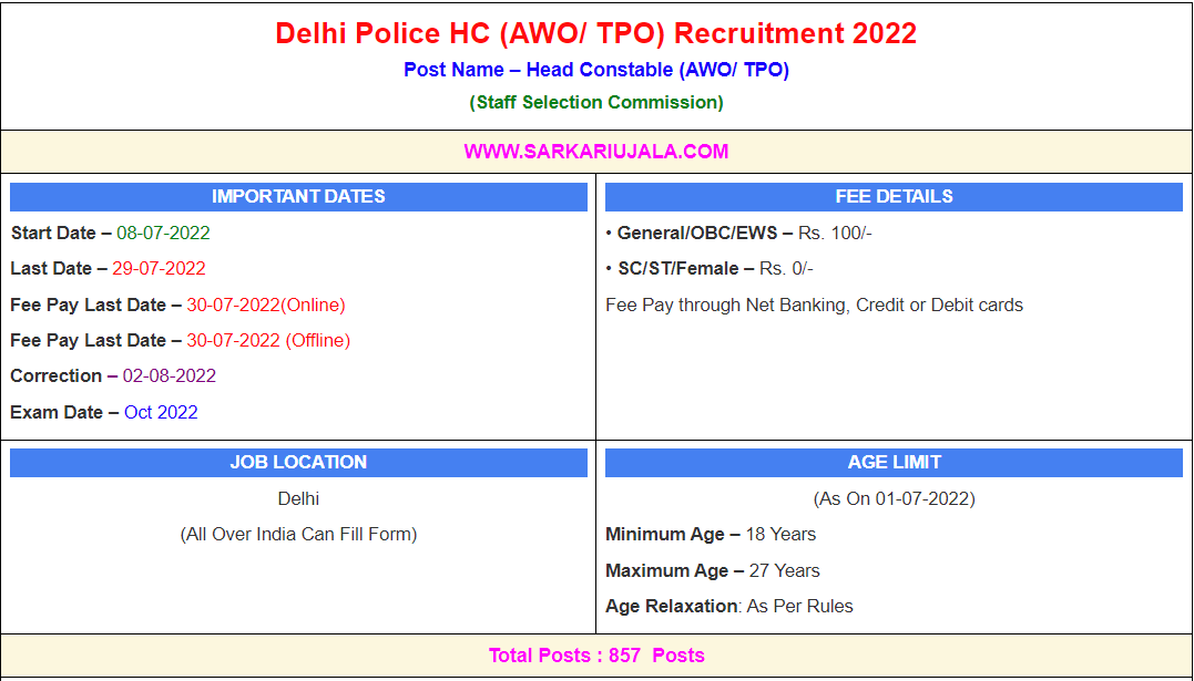 Post Description – SSC Staff Selection Commission is inviting online applications for Head Constable(AWO/ TPO) 857 posts. Interested people meet all the eligibility criteria, apply online Details Of Recruitment Of Delhi Police Head Constable (AWO/ TPO) Online Form 2022Posts Name – Head Constable (AWO/ TPO) Number Of Posts – 857 Posts Category Wise Posts – Head Constable (Male) – General – 213 Posts OBC –128 Posts SC –106 Posts ST – 68 Posts EWS –58 Posts Head Constable (Female) – General –107 Posts OBC –63 Posts SC –52 Posts ST – 33 Posts EWS –29 Posts Pay Scale – As Per Rules Education Qualification – 10+2 Passed With Science And Mathematics OR National Trade Certificate (NTC) In Trade Of Mechanics- cum-Operator Electronic Communication System. Physical Standard Height: 170cm (Male), 157Cm (Female) Chest : 81cm -85 Cm Running- 1600 Meter in 7 Minute (Male) ,800 Meter in 5 Minute (Female) High Jump – 3 feet 6 Inch (Male ) , 3 Feet (Female) Long Jump – 12 feet 6 Inch (Male ) , 9 Feet (Female) How to Apply Online Delhi Police HC (AWO/ TPO) Online Form 2022 – Candidates can apply through link provided below or they can also apply through official site of the Staff Selection Commission before 29/July/2022. Required Documents For Online Application – 10th / 12th Mark sheet And Certificates Aadhar Card / Pan Card Passport Size Photo Signature Selection Mode – CBT Exam PET/PST Merit List