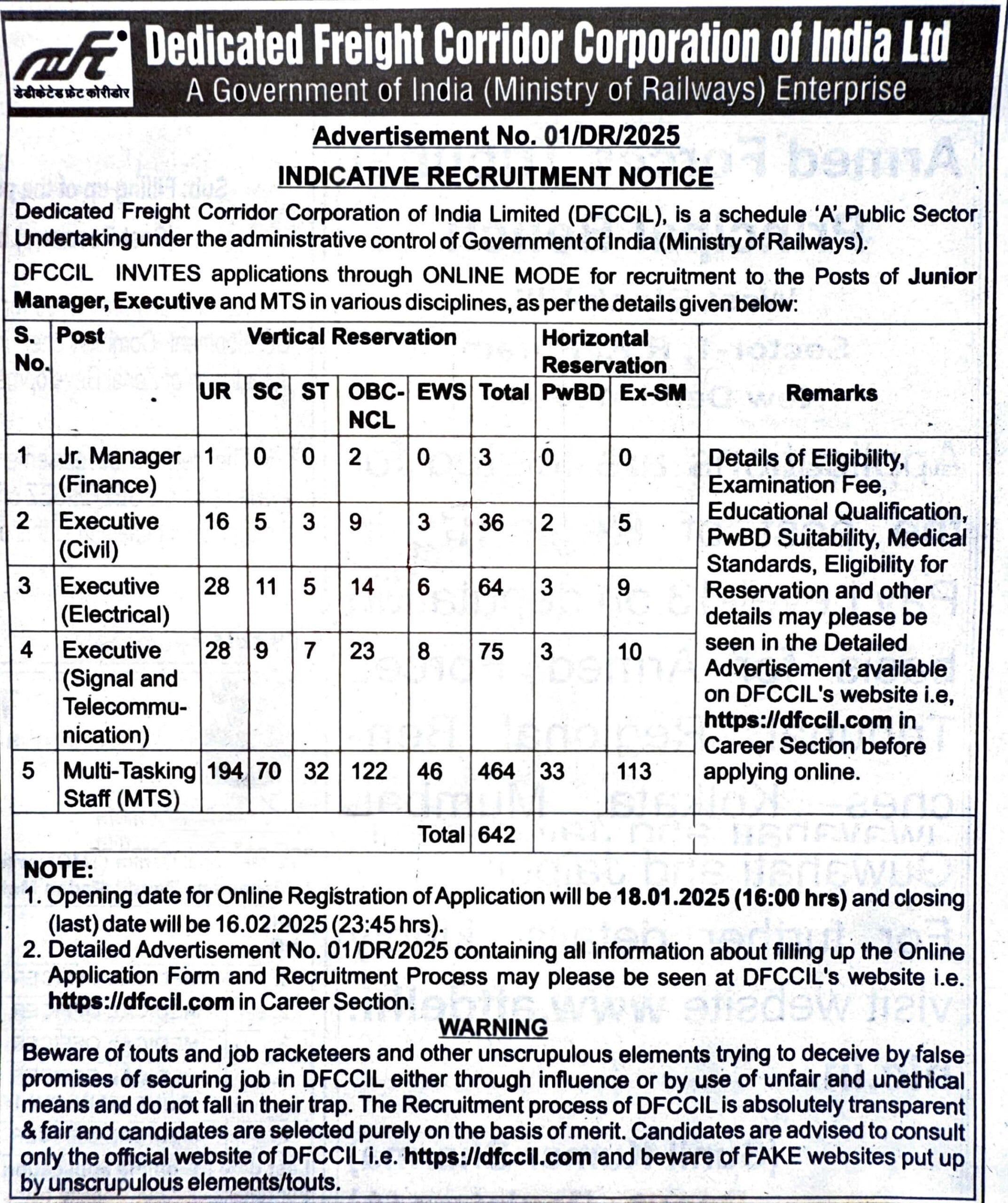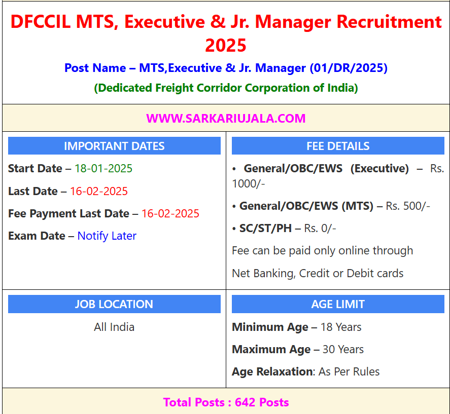 Post Description – DFCCIL is recruiting 642 posts for MTS, Executive, and Junior Manager under 01/DR/2025. Apply online from January 18 to February 16, 2025. Eligibility: Executive (Civil) – Diploma in Civil Engg., Executive (Electrical) – Diploma in Electrical Engg., Executive (Signal & Telecom) – Diploma in related field, MTS – 10th Pass/ITI. Fees: ₹1000 (Executive), ₹500 (MTS), free for SC/ST/PH. Age: 18-30 years (relaxation as per rules). Exam date to be announced. Details Of Recruitment Of DFCCIL MTS, Executive & Jr. Manager Online Form 2025Posts Name – MTS, Executive & Junior Executive Number Of Posts – 642 Posts Category Wise Posts – Jr. Manager (Finance) – 03 Posts Executive (Civil) – 36 Posts Executive (Electrical) – 64 Posts Executive (Signal & Telecom) – 75 Posts Multi Tasking Staff (MTS) – 464 Posts Pay Scale – As Per Rules Education Qualification – Jr. Manager (Finance) – CA/CMA final pass from ICAI/ICMAI. Executive (Civil) – 3 years Diploma in Civil Engg./ Civil Engg. (Transportation)/ Civil Engg. (Construction Technology)/ Civil Engg. (Public Health)/ Civil Engg. (Water Resource) from a recognized University / Institute with not less than 60% marks. Executive (Electrical) – 3 years Diploma in Electrical / Electronics / Electrical & Electronics/ Power Supply/ Instrumental & Control / Industrial Electronics/ Electronics & Instrumentation / Applied Electronics / Digital Electronics / Instrumentation / Power Electronics /Electronics & Control Systems from a recognized University / Institute with not less than 60% marks. Executive (Signal & Telecom) – Diploma (3 years) with at least 60% marks from a recognized University/Institute in any of the following: Electrical & Electronics, Electronics & Communication, Electronics & Telecommunication, Electronics & Instrumentation, Electronics & Computer, Electronics & Control Systems, Power Electronics, Rail System & Communication, Electrical, Microelectronics, Telecommunication, Communication, Instrumentation, Instrumentation & Control, Instrumentation Technology, IT, ICT, Information Science & Technology, Computer Science & Engineering, Computer Science, Computer Engineering, or Microprocessor. Multi Tasking Staff (MTS) – 10th Passed And minimum 1 year duration Course completed Act Apprenticeship/ITI approved by NCVT/SCVT with not less than 60% marks in ITI How to Apply Online DFCCIL MTS, Executive & Jr. Manager Online Form 2025– Candidates can apply through link provided below or they can also apply through official site of the Dedicated Freight Corridor Corporation of India before 16/February/2025. Required Documents For Online Application – Educational Mark sheet And Certificates Aadhar Card / Pan Card Passport Size Photo Signature Selection Mode – CBT Exam DV List Merit List