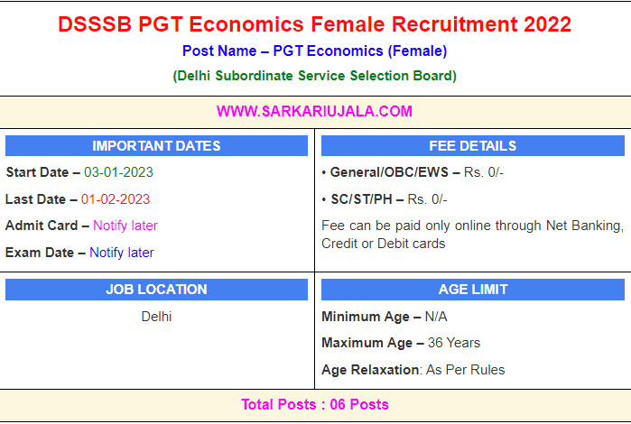 DSSSB PGT Economics Female Recruitment 2022Post Name – PGT Economics (Female)(Delhi Subordinate Service Selection Board) | |||||