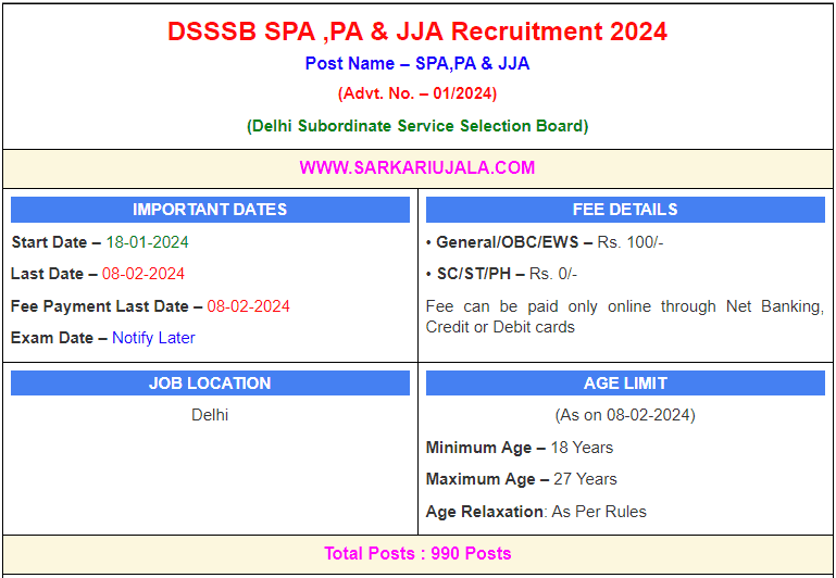 DSSSB SPA ,PA & JJA Recruitment 2024Post Name – SPA,PA & JJA(Advt. No. – 01/2024) (Delhi Subordinate Service Selection Board) | |||||