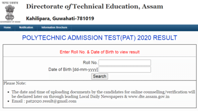 The Directorate of Technical Education, Assam (DTE Assam) has declared the results of the Polytechnic Admission Test (PAT) 2020 on its official website.