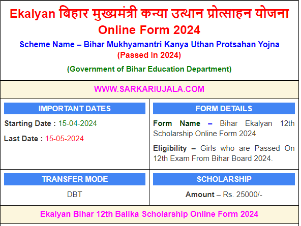 Ekalyan Bihar 12th Balika Scholarship Online Form 2024 | |||||