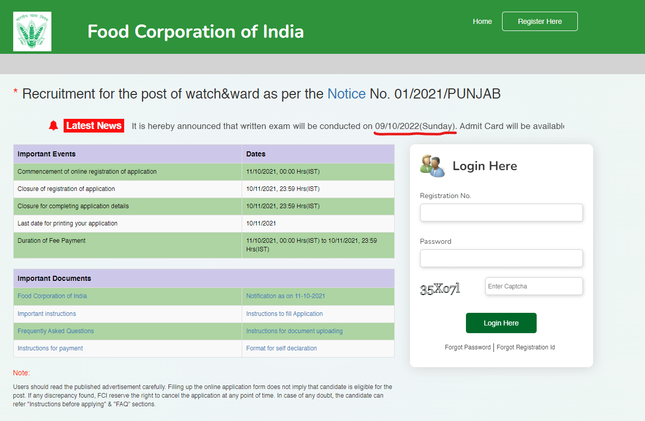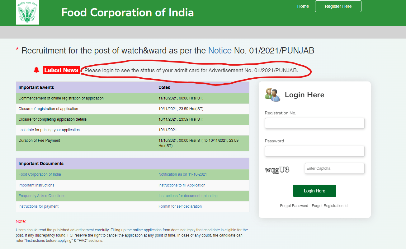 FCI Punjab Watchman Admit Card 2022Post Name – Watchman(Food Corporation Of India) | |||||