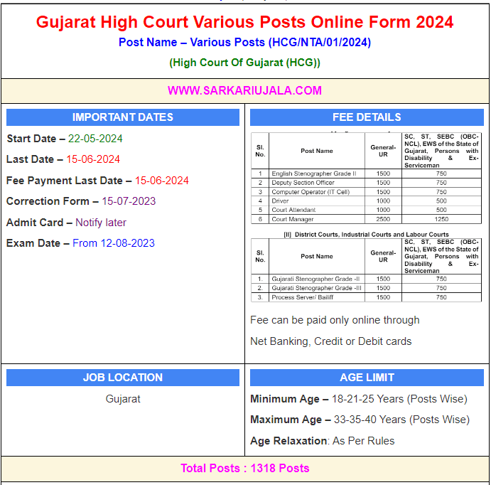 Post Description – GHC Gujarat High Court is inviting online applications for Various Posts for 1318 posts. Interested people meet all the eligibility criteria, apply online Details Of Recruitment Of Gujarat High Court Online Form 2024Posts Name –Various Posts Number Of Posts – 1318 Posts Category Wise Posts – English Stenographer – 54 Posts Deputy Section Officer (DSO) – 122 Posts Computer Operator – 148 Posts Driver – 34 Posts Court Attendant – 208 Posts Court Manager – 21 Posts Gujarati Steno Grade-II – 214 Posts Gujarati Steno Grade-III – 307 Posts Process Server/ Bailiff – 210 Posts Pay Scale – As Per Rules Education Qualification – English Stenographer – Graduate from recognized University And 100 words per minute in English Short Hand And Knowledge of Computer Operation. Deputy Section Officer (DSO) – Graduate from recognized University. And 10th or 12th Standard Examination passed with English as one of the Subjects Computer Operator – Bachelor’s Degree in Computer Application/Information Technology / Computer Science OR 03 years Diploma Course in Computer Science/Information Technology OR Bachelor’s Degree And Diploma of at least one Year duration in Data Entry Operation/Computer Application/Computer Programming/“O” Level Course. Driver – 10th Passed And LMV Licence And 5 Years Experience. Court Attendant – 10th Passed Court Manager – MBA/ Diploma in Management And 5 Yrs. Exprince Gujarati Steno Grade-II – Graduate Degree And Gujarati Steno 90 wpm And Computer Knowledge Gujarati Steno Grade-III – Graduate Degree And Gujarati Steno 70 wpm And Computer Knowledge. Process Server/ Bailiff – 12th Passed And 2-Wheeler Driving License And Computer Knowledge. How to Apply Online Gujarat High Court Online Form 2024 – Candidates can apply through link provided below or they can also apply through official site of the Gujarat High Court before 15/June/2024. Required Documents For Online Application – Educational Mark sheet And Certificates Aadhar Card / Pan Card Passport Size Photo Signature Selection Mode – Written Exam Skill Test Merit List | |||||