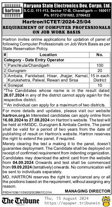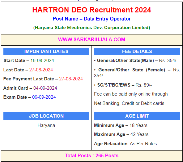 Post Description – HARTRON Haryana State Electronics Development Corporation Limited is inviting online applications for Data Entry Operator for 265 posts. Interested people meet all the eligibility criteria, apply online Details Of Recruitment Of HARTRON Haryana DEO Data Entry Operator Online Form 2024Posts Name – Data Entry Operator Number Of Posts – 265 Posts District Wise Posts – Panchkula/Chandigarh – 100 Posts Gurugram – 20 Posts Ambala– 15 Posts Faridabad – 15 Posts Hisar – 15 Posts Jhajjar – 15 Posts Karnal – 15 Posts Kururshetra –15 Posts Palwal – 15 Posts Rewari – 15 Posts Sirsa – 15 Posts Sonepat – 10 Posts Pay Scale – As per rules Education Qualification – 12th Passed with 50% Marks / Graduation and ‘O’ Level or One Year Computer Course. OR 3 Year Diploma in Stream/ BCA/ B.Sc. (Computer Science/ IT) OR 10th Pass (with 50% Marks) with 2 years diploma in Office Management and Computer Applications. OR Post Matric One Year ITI Course in Stenography/ NCVT in Stenography (with 60% marks). AND Data Punching Speed of 9000 Key depressions per hour or 150 key depressions per minute (30 words per minute) in English. How to Apply Online HARTRON DEO Data Entry Operator Online Form 2024 – Candidates can apply through link provided below or they can also apply through official site of the Haryana State Electronics Development Corporation Limited before 27/August/2024. Required Documents For Online Application – 10th / 12th Mark sheet And Certificates Aadhar Card / Pan Card Passport Size Photo Signature Selection Mode – Written Exam Typing Test Merit List | |||||