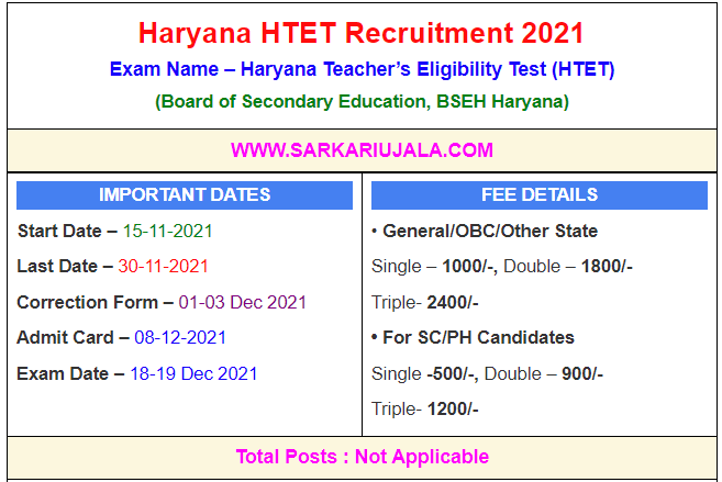 Haryana HTET Recruitment 2021Exam Name – Haryana Teacher’s Eligibility Test (HTET)(Board of Secondary Education, BSEH Haryana) | |||||
