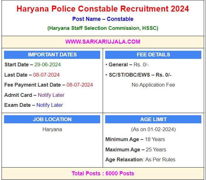 Post Description – HSSC Haryana Staff Selection Commission, HSSC is inviting online applications for Constable for 6000 posts. Interested people meet all the eligibility criteria, apply online Details Of Recruitment Of HSSC Haryana Police Constable Online Form 2024Posts Name – Constable Number Of Posts – 6000 Posts Category Wise Posts – Constable (Male) – 5000 Posts General – 1800 Posts SC – 900 Posts BCA – 700 Posts BCB – 400 Posts EWS – 500 Posts ESM-General – 350 Posts ESM-SC – 100 Posts ESM-BCA – 100 Posts ESM-BCB – 150 Posts Constable (Female) – 1000 Posts General – 360 Posts SC – 180 Posts BCA – 140 Posts BCB – 80 Posts EWS – 100 Posts ESM-General – 70 Posts ESM-SC – 20 Posts ESM-BCA – 20 Posts ESM-BCB – 30 Posts Pay Scale – Rs 21,700/- (Level -3) Education Qualification – 12th Class Pass From A Recognized Board And CET (Group C) Exam Qualified. Race:– 2.5 KM In 12 Minute (Male) , 1 KM In 6 Minute (Female) And 1 KM In 5 Minute (ESM) How to Apply Online HSSC Haryana Police Constable Online Form 2024 – Candidates can apply through link provided below or they can also apply through official site of the Haryana Staff Selection Commission, HSSC before 09/July/2024. Required Documents For Online Application – 10th / 12th Mark sheet And Certificates Aadhar Card / Pan Card Passport Size Photo Signature Selection Mode – Written Exam PET/PST Merit List