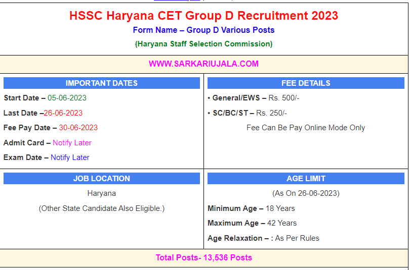Post Description – HSSC Haryana Staff Selection Commission is inviting online applications for Various Posts Of Group D Through HSSC CET OTR Registration 2023 For 13,536 Posts . Interested people meet all the eligibility criteria, apply online Details Of Recruitment Of HSSC Haryana CET Group D Online Form 2023Total Posts – 13,536 Posts Pay Scale – Rs. 16900/- To Rs. 53500/- Education Qualification – 10th Passed in Any Recognized Institute in India. (Other State Candidate Also Eligible.) How to Apply Online HSSC Haryana CET Group D Online Form 2023 – Candidates can apply through link provided below or they can also apply through official site of the Haryana Staff Selection Commission Before 26 June 2023. Required Documents For Online Application – Educational Mark sheet And Certificates Aadhar Card / Pan Card Passport Size Photo Signature