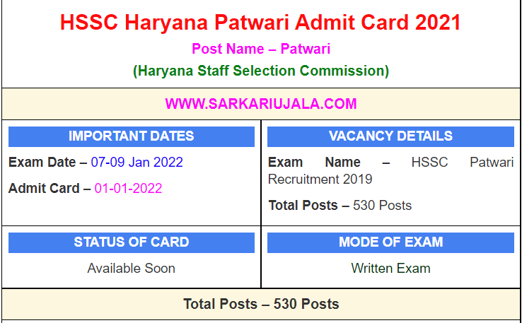 Post Description : HSSC Haryana Staff Selection Commission has declared the exam date of  Patwari posts , which is 26-28 Dec 2021. so now you have to prepare for the exam very well, our best wishes are with you! And keep checking SarkariUjala.Com for new updates .