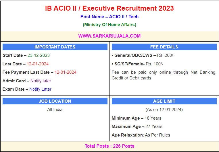 Post Description – MHA IB Intelligence Bureau is inviting online applications for ACIO II / Tech for 226 posts. Interested people meet all the eligibility criteria, apply online Details Of Recruitment Of MHA IB ACIO II / Executive Online Form 2023Posts Name – IB ACIO II / Executive Number Of Posts – 226 Posts Category Wise Posts – Computer Science & Information Technology – 79 Posts General – 32 Posts OBC – 25 Posts SC – 11 Posts ST – 03 Posts EWS – 08 Posts Electronics & Communication – 147 Posts General – 61 Posts OBC – 46 Posts SC – 18 Posts ST – 06 Posts EWS – 16 Posts Pay Scale – Rs.44,900 –1,42,400/- Education Qualification – B.E. / B. Tech In Related Fields OR Master Degree In Science With Electronics/Physics With Electronics & Communication/Computer Science OR Master’s Degree in Computer Applications. And GATE 2021 or 2022 or 2023 Qualified. How to Apply Online IB ACIO Grade II / Technical Online Form 2023 – Candidates can apply through link provided below or they can also apply through official site of the Intelligence Bureau before 12/January/2024. Required Documents For Online Application – Educational Mark sheet And Certificates Aadhar Card / Pan Card Passport Size Photo Signature Selection Mode – CBT Exam Merit List