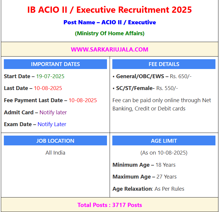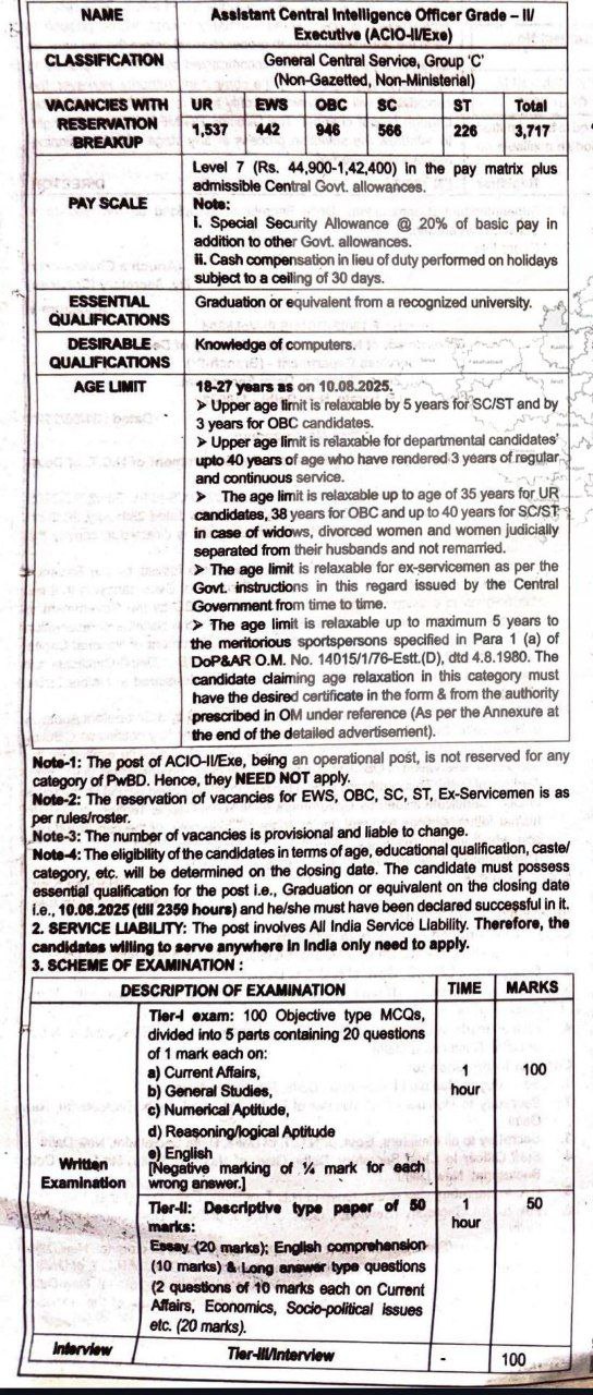 Post Description – MHA IB Intelligence Bureau is inviting online applications for IB ACIO II / Executive for 3717 posts. Interested people meet all the eligibility criteria, apply online Details Of Recruitment Of MHA IB ACIO II / Executive Online Form 2025Posts Name – ACIO II / Executive Number Of Posts – 3717 Posts Category Wise Posts – General – 1537 Posts EWS – 442 Posts OBC – 946 Posts SC – 566 Posts ST – 226 Posts Pay Scale – Rs. 44,900 – 1,42,400/- (Level-7) Education Qualification – Bachelor Degree in Any Stream in Any Recognized University in India. How to Apply Online MHA IB ACIO II / Executive Online Form 2025 – Candidates can apply through link provided below or they can also apply through official site of the Intelligence Bureau before 10/August/2025. Required Documents For Online Application – Educational Mark sheet And Certificates Aadhar Card / Pan Card Passport Size Photo Signature Selection Mode – CBT Exam Interview Merit List