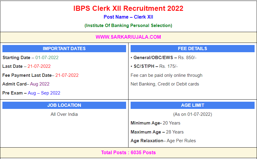 Post Description –IBPS Institute Of Banking Personal Selection is inviting online applications for IBPS Clerk XII Online Form 2023-24 for 6035 Posts. Interested people meet all the eligibility criteria, apply online DETAILS OF PARTICIPATING BANKS-Bank of Baroda, Canara Bank, Indian Overseas Bank ,UCO Bank ,Bank of India ,Central Bank of India, Punjab National Bank, Union Bank of India, Bank of Maharashtra, Indian Bank ,Punjab & Sind Bank Details Of Recruitment Of IBPS Clerk XII Online Form 2022Posts Name – Clerk XII Total Posts – 6035 Posts Category Wise Posts – General – 2767 Posts OBC– 1379 Posts EWS– 538 Posts SC– 951 Posts ST – 400 Posts State wise Post Details- Andaman & Nikobar – 04 Posts Andhra Pradesh – 209 Posts Arunachal Pradesh – 14 Posts Assam – 157 Posts Bihar – 281 Posts Chandigarh – 12 Posts Chhattisgarh –104 Posts Dadar & Nagar / Daman & Diu – 1 Posts Delhi – 295 Posts Goa – 71 Posts Gujarat – 304 Posts Haryana – 138 Posts Himachal Pradesh – 91 Posts Jammu Kashmir – 35 Posts Jharkhand – 69 Posts Karnataka – 358 Posts Kerala – 70 Posts Lakshadweep – 5 Posts Madhya Pradesh – 309 Posts Maharashtra – 775 Posts Manipur – 4 Posts Meghalaya – 6 Posts Mizoram – 4 Posts Nagaland – 4 Posts Odisha – 126 Posts Puducherry – 2 Posts Punjab – 407 Posts Rajasthan – 129 Posts Sikkim – 11 Posts Tamil Nadu – 288 Posts Telangana – 99 Posts Tripura – 17 Posts Uttar Pradesh – 1089 Posts Uttarakhand – 19 Posts West Bengal – 528 Posts Pay Scale – As Per Rules Education Qualification – Graduation Degree In Any Subject (before 21-07-2022) How to Apply Online IBPS Clerk XII Online Form 2022 – Candidates can apply through link provided below or they can also apply through official site of the IBPS before 21/July/2022 Required Documents For Online Application – Educational Mark sheet And Certificates Aadhar Card / Pan Card Passport Size Photo Left Thumb Self Declaration Signature Selection Mode – Pre Exam Mains Exam Merit List