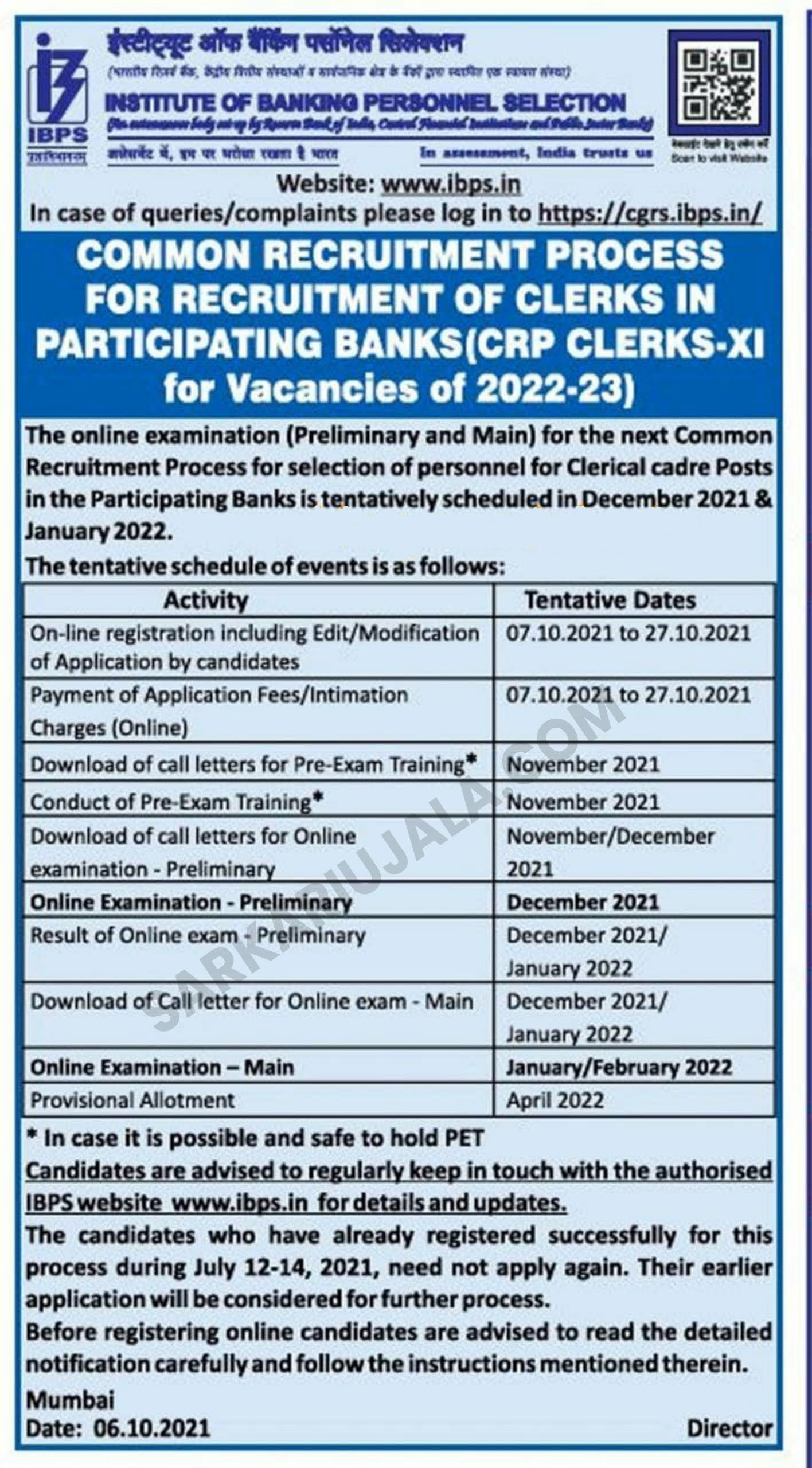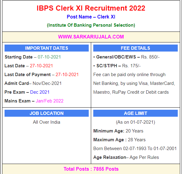Post Description –IBPS Institute Of Banking Personal Selection is inviting online applications for IBPS Clerk XI Online Form 2022-23 for 7855 Posts posts. Interested people meet all the eligibility criteria, apply online Details Of Recruitment Of IBPS Clerk XI Online Form 2021Posts Name – Clerk Total Posts – 7855 Posts PARTICIPATING BANK ORGANISATIONS: Bank of Baroda Canara Bank Indian Overseas Bank UCO Bank Bank of India Central Bank of India Punjab National Bank Union Bank of India Bank of Maharashtra Indian Bank Punjab & Sind Bank Number Of Posts – 7855 Posts Category Wise Posts – General – 2749 Posts OBC– 1087 Posts EWS– 694 Posts SC-756 Posts ST – 484 Posts State wise Post Details- Andaman & Nikobar – 05 Posts Uttar Pradesh – 1039 Posts Uttarakhand – 58 Posts Delhi – 318 Posts Bihar – 300 Posts Jharkhand – 111 Posts Madhya Pradesh – 389 Posts Chhattisgarh – 111 Posts Haryana – 133 Posts Rajasthan – 142 Posts Maharashtra – 882 Posts West Bengal – 516 Posts Himachal Pradesh – 113 Posts Andhra Pradesh – 387 Posts Arunachal Pradesh – 13 Posts Assam – 191 Posts Chandigarh – 33 Posts Dadar & Nagar / Daman & Diu – 03 Posts Goa – 59 Posts Gujarat – 395 Posts Jammu Kashmir – 26 Posts Karnataka – 454 Posts Kerala – 194 Posts Lakshyadeep – 05 Posts Manipur – 06 Posts Megalaya – 09 Posts Mizoram – 04 Posts Nagaland – 13 Posts Odisha – 302 Posts Puducheery – 30 Posts Punjab – 402 Posts Sikkim – 28 Posts Tamil Nadu –843 Posts Telangana – 333 Posts Tripura – 08 Posts Pay Scale – As Per Rules Education Qualification – Graduation Degree (Final Before 27-10-2021) How to Apply Online IBPS Clerk XI Online Form 2021 – Candidates can apply through link provided below or they can also apply through official site of the IBPS before 27/Oct/2021. Required Documents For Online Application – Educational Mark sheet And Certificates Aadhar Card / Pan Card Passport Size Photo Left Thumb Self Declaration Signature Selection Mode – Pre Examination Mains Examination Final Merit List