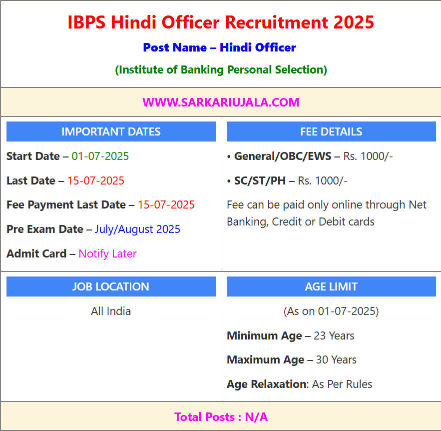Post Description – IBPS Institute of Banking Personal Selection is inviting online applications for Hindi Officer posts. Interested people meet all the eligibility criteria, apply online Details Of Recruitment Of IBPS Hindi Officer Online Form 2025Posts Name – Hindi Officer Number Of Posts – N/A Pay Scale – As Per Rules Education Qualification – Master’s degree from a recognized university in Hindi with English as a major or elective subject at Graduation. OR Master’s degree from a recognized university in English with Hindi as major or elective subject at Graduation. OR Master’s degree from a recognized university in any subject other than Hindi or English, with Hindi as a major or elective subject and English as medium of examination at degree level. OR Master’s degree from a recognized University in any subject other than Hindi or English with English as a major or elective subject and Hindi as medium of examination at degree level. How to Apply Online IBPS Hindi Officer Online Form 2025 – Candidates can apply through link provided below or they can also apply through official site of the Institute of Banking Personal Selection before 15/July/2025. Required Documents For Online Application – Educational Mark sheet And Certificates Aadhar Card / Pan Card Passport Size Photo Signature Selection Mode – CBT Exam Mains Exam Interview Final Merit List