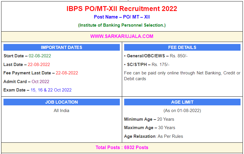 Post Description –IBPS Institute of Banking Personnel Selection is inviting online applications for PO/MT for 6932 posts. Interested people meet all the eligibility criteria, apply online Details Of Recruitment Of IBPS PO XII Online Form 2022Posts Name – Probationary Officers (PO/MT) Number Of Posts – 6932 Posts Bank Wise Posts – Bank Of Baroda – Not Reported Bank Of India – 535 Posts Bank Of Maharashtra – 500 Posts Canara Bank – 2500 Posts Central Bank Of India – Not Reported Indian Bank – Not Reported Indian Overseas Bank – Not Reported Punjab National bank – 500 Posts Punjab & Sindh Bank – 253 Posts UCO Bank – 550 Posts Union Bank Of India – 2094 Posts Category Wise Posts – General – 2799 Posts OBC – 1876 Posts SC – 1071 Posts ST – 520 Posts EWS – 666 Posts Pay Scale – As Per Rules Education Qualification – Bachelor Degree In Any Subject (As on 22-08-2022) How to Apply Online IBPS PO XII Online Form 2022 – Candidates can apply through link provided below or they can also apply through official site of the Institute of Banking Personnel Selection before 22/Aug/2022. Required Documents For Online Application – Educational Mark sheet And Certificates Aadhar Card / Pan Card Thumb Impression Passport Size Photo Signature Selection Mode – Pre Exam mains Exam Interview Final Merit List