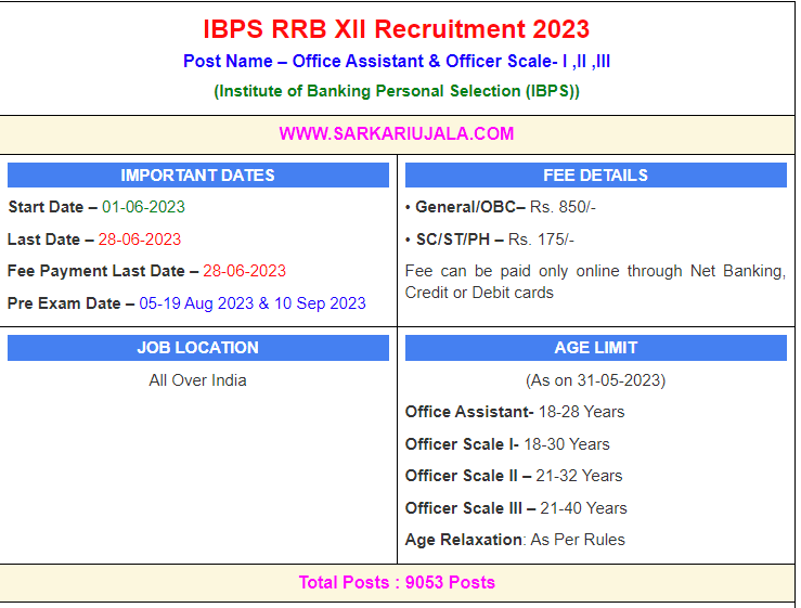 Post Description – IBPS Institute of Banking Personal Selection is inviting online applications for Office Assistant & Officer Scale- I ,II ,III for 8611 posts. Interested people meet all the eligibility criteria, apply online Details Of Recruitment Of Garmin Bank IBPS RRB XII Online Form 2023Posts Name – Office Assistant & Officer Scale- I ,II ,III Number Of Posts – 9053 Posts Category Wise Posts – Office Assistant (Multipurpose) – 5650 Posts Officer Scale-I – 2563 Posts General Banking Officer (Manager) Scale-II – 367 Posts IT Officer Scale-II- 106 Posts CA Officer Scale-II- 63 posts Law Officer Scale-II- 56 posts Treasury Manager Scale-II- 16 posts MBA Finance Marketing Officer Scale-II- 38 posts MBA Marketing Agriculture Officer Scale-II- 118 posts Officer Scale-III – 76 Posts Pay Scale – As Per Rules Education Qualification – Office Assistant (Multipurpose) – Graduation Degree in Any Stream . Officer Scale-I – Graduation Degree in Any Stream General Banking Officer (Manager) Scale-II – Graduation Degree in Any Stream with 50% Marks and 2 Year Experience. IT Officer Scale-II- Graduation Degree in Electronics / Communication / Computer Science / Information Technology with 50% Marks and 1 Year Post Experience. CA Officer Scale-II- C.A. Exam Passed from ICAI India and One Year Experience as a CA. Law Officer Scale-II- Graduation Degree in Law (LLB) with 50% Marks and 2 Year Advocacy Experience Treasury Manager Scale-II- CA or MBA in Finance from a recognized university/ institution And 1 Year Experience. Marketing Officer Scale-II- MBA in Marketing from a recognized university And 1 Year Experience in Recognized Sector. Agriculture Officer Scale-II-Bachelor Degree in Agriculture/ Horticulture/ Dairy/ Animal / Veterinary Science / Engineering / Pisciculture with 2 Year Experience. Officer Scale-III – Graduation Degree in Any Stream with Minimum 50% Marks with Minimum 5 Year Post Experience. How to Apply Online Gramin Bank IBPS RRB XII Online Form 2023 – Candidates can apply through link provided below or they can also apply through official site of the Institute of Banking Personal Selection before 21/June/2023. Required Documents For Online Application – Educational Mark sheet And Certificates Aadhar Card / Pan Card Passport Size Photo Signature Selection Mode – Pre & Main Exam Interview Final Merit List