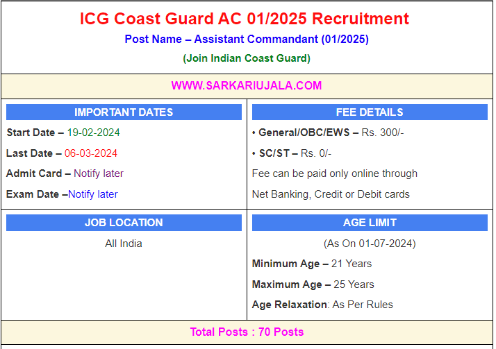 Post Description – ICG Join Indian Coast Guard is inviting online applications for Assistant Commandant For 70 posts. Interested people meet all the eligibility criteria, apply online Details Of Recruitment Of Coast Guard AC 01/2025 Online FormPosts Name – Assistant Commandant Number Of Posts – 70 Posts Category Wise Posts – Soon Pay Scale – Rs.56100 – 225000/- + Grade Pay Rs.1900/- Education Qualification – General Duty – 50 Posts Tech (Engg./Elect.)- 20 Posts General Duty – Bachelor Degree with Minimum 60% Marks . & Maths , Physics as a Subject in 10+2 Level Examination Technical (Mechanical)- B.Tech in Naval Architecture/Mechanical/ Marine /Automotive/Mechatronics/Industrial and Production/Metallurgy/Design/Aeronautical/Aerospace with 60% Marks Technical (Electrical/ Electronics) – B.Tech in Electrical/ Electronics /Telecommunication/Instrumentation/Instrumentation and Control / Electronics and Communication / Power Engineering/ Power Electronics with 60% Marks. How to Apply Online Coast Guard AC 01/2025 Online Form – Candidates can apply through link provided below or they can also apply through official site of the Join Indian Coast Guard before 06/March/2024. Required Documents For Online Application – Educational Mark sheet And Certificates Aadhar Card / Pan Card Passport Size Photo Signature Selection Mode – Stage I & Stage II PET/PST Merit List
