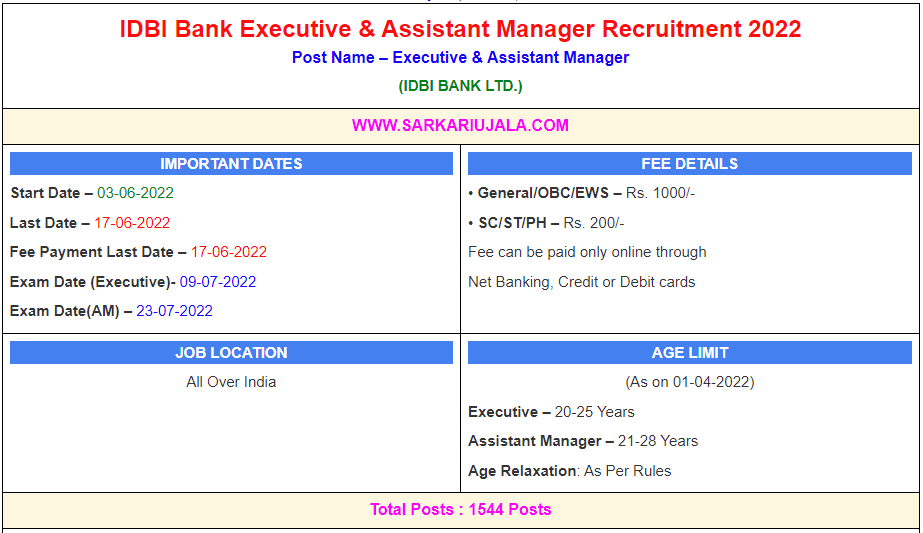 Post Description –IDBI bank Limited is inviting online applications for Executive & Assistant Manager for 1544 posts. Interested people meet all the eligibility criteria, apply online Details Of Recruitment Of IDBI Bank Executive & Assistant Manager Online Form 2022Posts Name – Executive & Assistant Manager Number Of Posts – 1544 Posts Category Wise Posts – Executive – 1044 Posts General – 418 Posts OBC – 268 Posts SC – 175 Posts ST – 79 Posts EWS – 104 Posts Assistant Manager “Grade A” – 500 Posts General – 200 Posts OBC – 101 Posts SC – 121 Posts ST – 28 Posts EWS – 50 Posts Pay Scale – Rs.36000 – 63840/- Education Qualification – Graduate in any discipline from a University recognized (Before 01-04-2022) How to Apply Online IDBI Bank Executive & Assistant Manager Online Form 2022 – Candidates can apply through link provided below or they can also apply through official site of the IDBI Bank Ltd before 17/June/2022. Required Documents For Online Application – Educational Mark sheet And Certificates Aadhar Card / Pan Card Passport Size Photo Signature Selection Mode – Written Examination Document Verification Interview Merit List