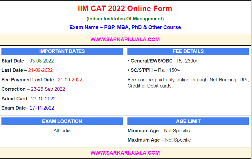 IIM CAT 2022 Online Form(Indian Institutes Of Management) Exam Name – PGP, MBA, PhD & Other Course | |||||