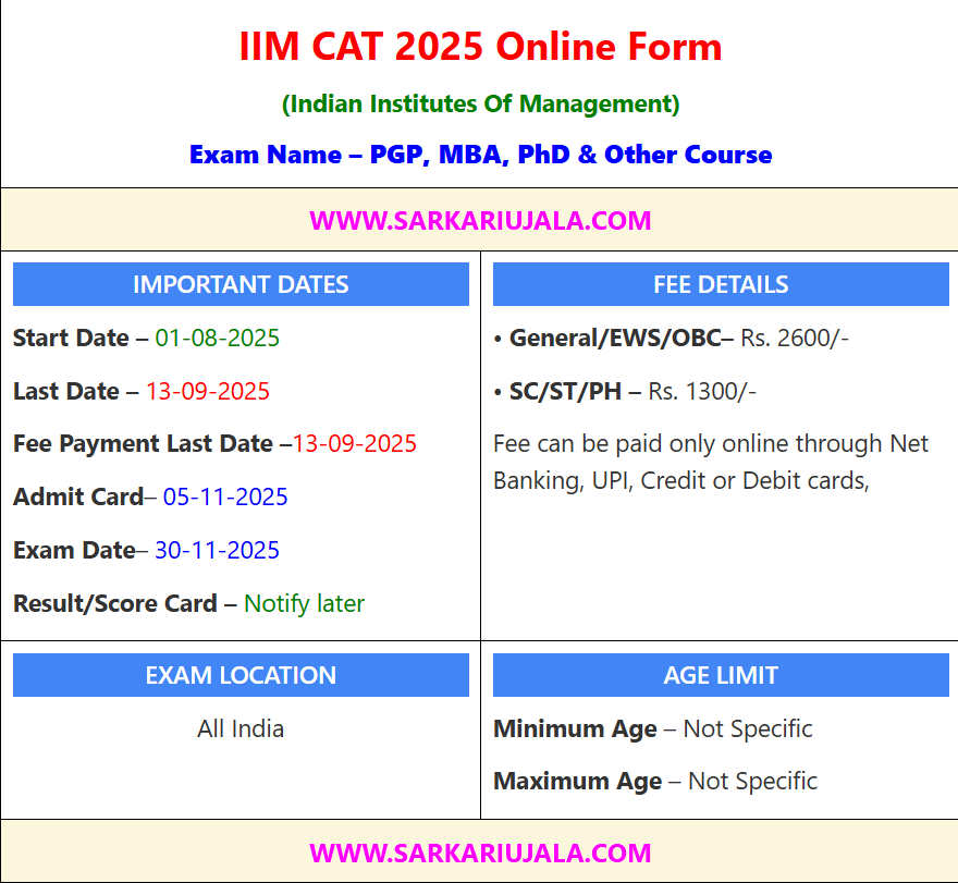 IIM CAT 2025 Online Form(Indian Institutes Of Management) Exam Name – PGP, MBA, PhD & Other Course | |||||