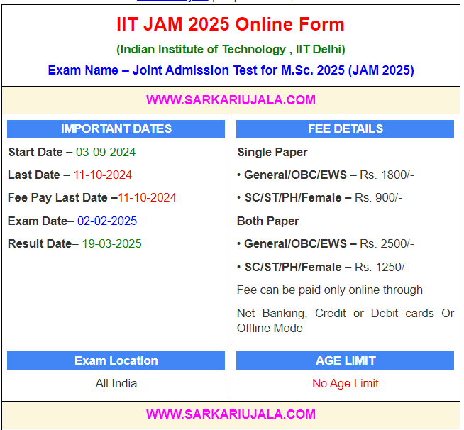 IIT JAM 2025 Online Form(Indian Institute of Technology , IIT Delhi) Exam Name – Joint Admission Test for M.Sc. 2025 (JAM 2025) | |||||