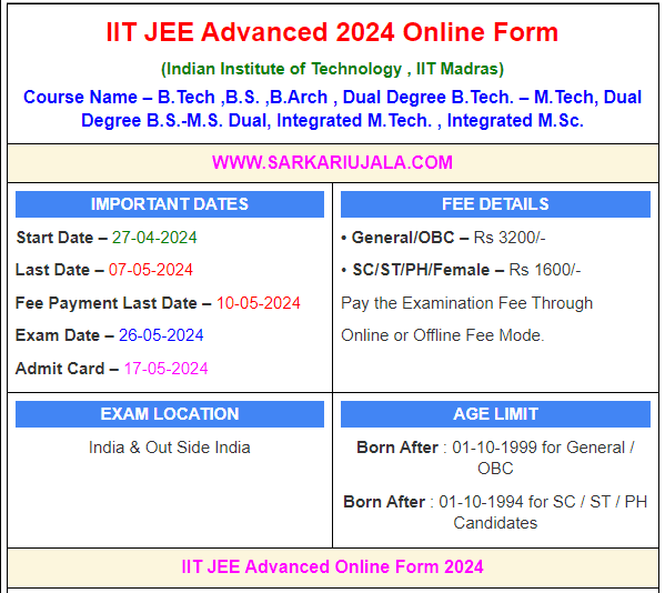 Post Description – IIT Indian Institute of Technology , IIT Bombay is inviting online applications for IIT JEE Advanced Online Form 2024 for Entrance Examination & Admission. Interested people meet all the eligibility criteria, apply online Details Of Recruitment Of IIT JEE Advanced Online Form 2024Course Name – B.Tech ,B.S. ,B.Arch , Dual Degree B.Tech. – M.Tech, Dual Degree B.S.-M.S. Dual, Integrated M.Tech. , Integrated M.Sc. Education Qualification – Passed JEE MAIN 2024 Entrance Test with Secured Qualified Marks How to Apply Online IIT JEE Advanced Online Form 2024 – Candidates can apply through link provided below or they can also apply through official site of the IIT Madras before 30/April/2024. Required Documents For Online Application – JEE Mains Mark sheet And Certificates Aadhar Card / Pan Card Passport Size Photo Signature Other Relevant Document Selection Mode – CBT Exam Seat Allotment List