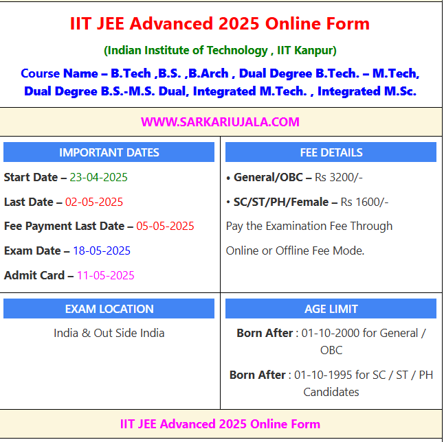 Post Description – IIT Indian Institute of Technology , IIT Kanpur is inviting online applications for IIT JEE Advanced Online Form 2025 for Entrance Examination & Admission. Interested people meet all the eligibility criteria, apply online Details Of Recruitment Of IIT JEE Advanced Online Form 2025Course Name – B.Tech ,B.S. ,B.Arch , Dual Degree B.Tech. – M.Tech, Dual Degree B.S.-M.S. Dual, Integrated M.Tech. , Integrated M.Sc. Education Qualification – Passed JEE MAIN 2025 Entrance Test with Secured Qualified Marks How to Apply Online IIT JEE Advanced Online Form 2025 – Candidates can apply through link provided below or they can also apply through official site of the IIT Kanpur before 30/April/2025. Required Documents For Online Application – JEE Mains Mark sheet And Certificates Aadhar Card / Pan Card Passport Size Photo Signature Other Relevant Document Selection Mode – CBT Exam Seat Allotment List
