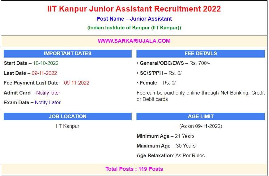 IIT Kanpur Junior Assistant Recruitment 2022Post Name – Junior Assistant(Indian Institute of Kanpur (IIT Kanpur)) | |||||