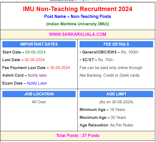 Post Description – IMU Indian Maritime University (IMU) is inviting online applications for Assistant Posts for 27 posts. Interested people meet all the eligibility criteria, apply online Details Of Recruitment Of IMU Non-Teaching Online Form 2024Posts Name – Assistant Number Of Posts – 27 Posts Category Wise Posts – Assistant –15 Posts Assistant (Finance) –12 Posts Pay Scale – As Per Rules Education Qualification – Assistant – Graduation Degree with 50% marks. Assistant (Finance)– Graduation with Commerce or Maths or Statistics With 50% Marks. How to Apply Online IMU Non-Teaching Online Form 2024 – Candidates can apply through link provided below or they can also apply through official site of the Indian Maritime University before 30/August/2024. Required Documents For Online Application – Educational Mark sheet And Certificates Aadhar Card / Pan Card Passport Size Photo Signature Selection Mode – Written Exam Merit List | |||||