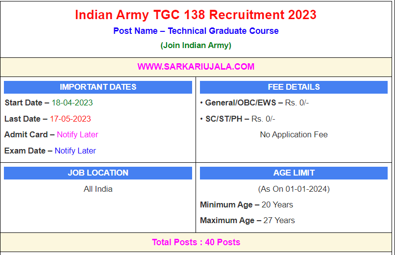 Post Description – Join Indian Army is inviting online applications for Technical Graduate Courses TGC posts. Interested people meet all the eligibility criteria, apply online Details Of Recruitment Of Indian Army TGC 138 Online Form 2023Posts Name – Technical Graduate Courses TGC Number Of Posts – 40 Posts Category Wise Posts – Civil / Building Construction Technology – Computer Science & Engineering / Computer Technology/ Info Tech/ M. Sc Computer Science – Mechanical / Production / Automobile / Equivalent – Electrical / Electrical & Electronics- Electronics & Telecom/ Telecommunication/ Satellite Communication- Misc. Engineering Stream – Pay Scale – Rs. 56,100/- Rs.2,50,000/- Education Qualification – Passed / Appearing Engineering Degree in Related Trade / Branch Or Final Year Appearing Candidate are also Eligible How to Apply Online Indian Army TGC 138 Online Form 2023 – Candidates can apply through link provided below or they can also apply through official site of the Join Indian Army before 17/May/2023. Required Documents For Online Application – Educational Mark sheet And Certificates Aadhar Card / Pan Card Passport Size Photo Signature Selection Mode – Written Examination PET/PST SSB Interview Final Merit List
