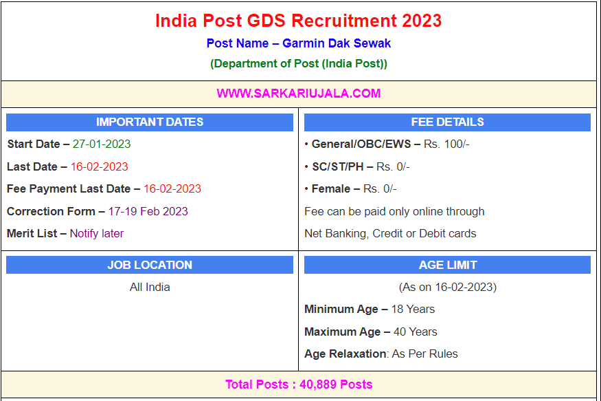 Post Description – Department of Post (Indian Posts) is inviting online applications for Garmin Dak Sewak for 40,889 posts. Interested people meet all the eligibility criteria, apply online Details Of Recruitment Of India Post GDS Online Form 2023Posts Name – Garmin Dak Sewak Number Of Posts – 40,889 Posts Category Wise Posts – General – 18122 posts OBC- 8285 Posts SC- 6020 Posts ST- 3476 Posts EWS- 3955 Posts PWDA- 292 Posts PWDB- 290 posts PWDC- 362 Posts PWDDE- 87 Posts State Wise Posts – Andhra Pradesh –2480 Posts Assam-407 Posts Bihar-1461 Posts Chhattisgarh-1593 Posts Delhi-46 Posts Gujarat -2017 Posts Haryana-354 Posts Himachal Pradesh-603 Posts Jammu / Kashmir-300 Posts Jharkhand-1590 Posts Karnataka-3036 Posts Kerala-2462 Posts Madhya Pradesh-1841 Posts Maharashtra-2508 Posts Odisha-1382 Posts Punjab-766 Posts Rajasthan –1684 Posts Tamil Naidu-3167 Posts Telangana-1266 Posts Uttar Pradesh– 7987 Posts Uttarakhand-889 Posts West Bengal-2127 Posts Pay Scale – BMP- Rs.12000 – 29380/- ABMP/Dak Sevak- Rs.10,000/- To Rs. 24,470/- Education Qualification – 10th Passed From A Recognized Board. And Knowledge Of Local Language. How to Apply Online India Post GDS Online Form 2023 – Candidates can apply through link provided below or they can also apply through official site of the Department of Post before 16/Feb/2023. Required Documents For Online Application – 10th Mark sheet And Certificates Aadhar Card / Pan Card Passport Size Photo Signature Selection Mode – Final Merit List