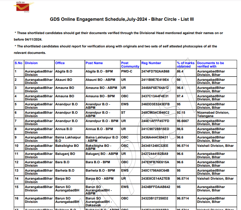 India Post GDS July Result 2024 | |||||