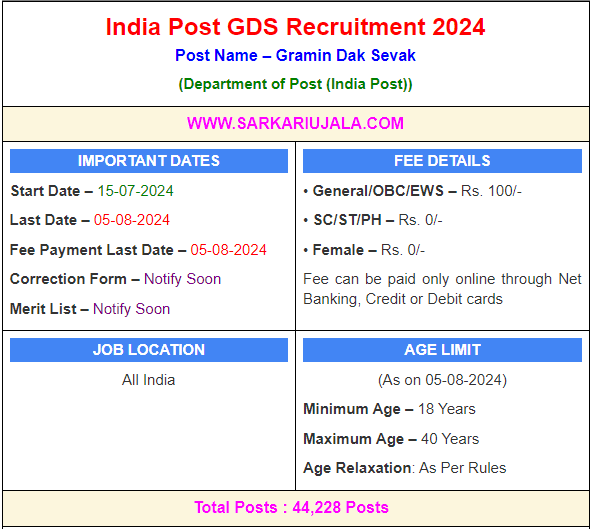 Post Description – Department of Post (Indian Posts) is inviting online applications for Garmin Dak Sevak for 44,228 posts. Interested people meet all the eligibility criteria, apply online Details Of Recruitment Of India Post GDS Online Form 2024Posts Name – Garmin Dak Sevak Number Of Posts – 44,228 Posts Category Wise Posts – General – 19862 Posts OBC- 8024 Posts SC- 5941 Posts ST- 4842 Posts EWS- 4330 Posts PWDA- 333 Posts PWDB- 373 Posts PWDC- 348 Posts PWDDE- 125 Posts State Wise Posts – Andhra Pradesh – 1355 Posts Assam- 896 Posts Bihar- 2558 Posts Chhattisgarh- 1338 Posts Delhi- 22 Posts Gujarat – 2034 Posts Haryana- 241 Posts Himachal Pradesh- 708 Posts Jammu / Kashmir- 442 Posts Jharkhand- 2404 Posts Karnataka- 1940 Posts Kerala- 2433 Posts Madhya Pradesh- 4011 Posts Maharashtra- 3170 Posts North Eastern- 2255 Posts Odisha- 2477 Posts Punjab- 387 Posts Rajasthan – 2718 Posts Tamil Naidu- 3789 Posts Telangana- 981 Posts Uttar Pradesh– 4588 Posts Uttarakhand- 1238 Posts West Bengal- 2543 Posts Pay Scale – BMP- Rs.12000 – 29380/- ABMP/Dak Sevak- Rs.10,000/- To Rs. 24,470/- Education Qualification – 10th Passed From A Recognized Board. And Knowledge Of Local Language. How to Apply Online India Post GDS Online Form 2024 – Candidates can apply through link provided below or they can also apply through official site of the India Posts. Required Documents For Online Application – 10th Mark sheet And Certificates Aadhar Card / Pan Card Passport Size Photo Signature Selection Mode – Final Merit List