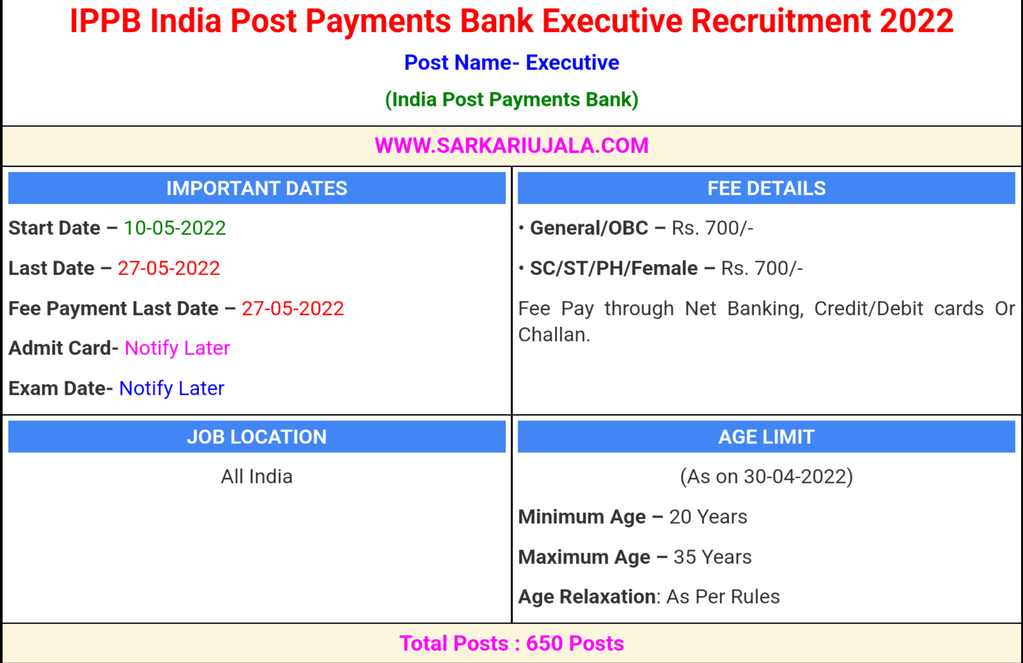 Post Description – IPPB India Post Payments Bank is inviting online applications for Executive Posts for 650 posts. Interested people meet all the eligibility criteria, apply online Details Of Recruitment Of India Post Payments Bank Executive Online Form 2022Posts Name – Executive Number Of Posts – 650 Posts Category Wise Posts – Andhra Pradesh – 34 Posts Assam – 25 Posts Bihar – 76 Posts Chhattisgarh – 20 Posts Delhi – 04 Posts Gujarat– 31 Posts Haryana– 12 Posts Himachal Pradesh– 09 Posts Jammu & Kashmir- 05 Posts Jharkhand – 08 Posts Karnataka – 42 Posts Kerala – 07 Posts MP – 32 Posts Maharashtra– 71 Posts Odisha– 20 Posts Punjab– 18 Posts Rajasthan – 35 Posts Tamil Nadu- 45 Posts Telangana– 21 Posts UP– 84 Posts Uttarakhand– 03 Posts West Bengal- 33 Posts North East– 15 Posts Pay Scale – As Per Rules Education Qualification – Bachelor Degree & having Minimum 2 years of experience as GDS. How to Apply Online India Post Payments Bank Executive Online Form 2022 – Candidates can apply through link provided below or they can also apply through official site of the India Post Payments Bank before 20/May/2022. Required Documents For Online Application – Educational Mark sheet And Certificates Aadhar Card / Pan Card Passport Size Photo Signature Selection Mode – CBT Exam Final Merit List