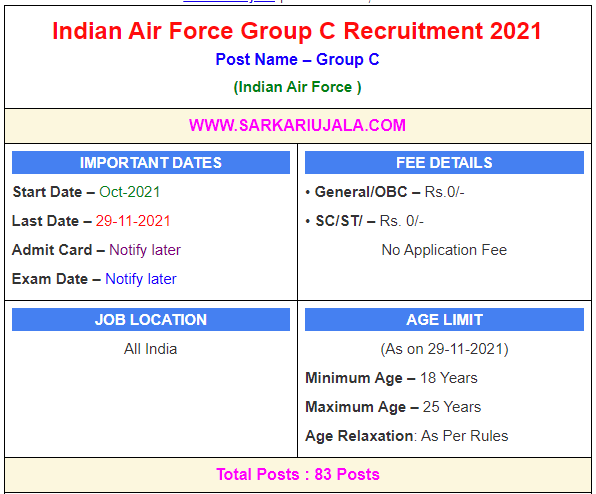Indian Air Force Group C Recruitment 2021Post Name – Group C(Indian Air Force ) | |||||