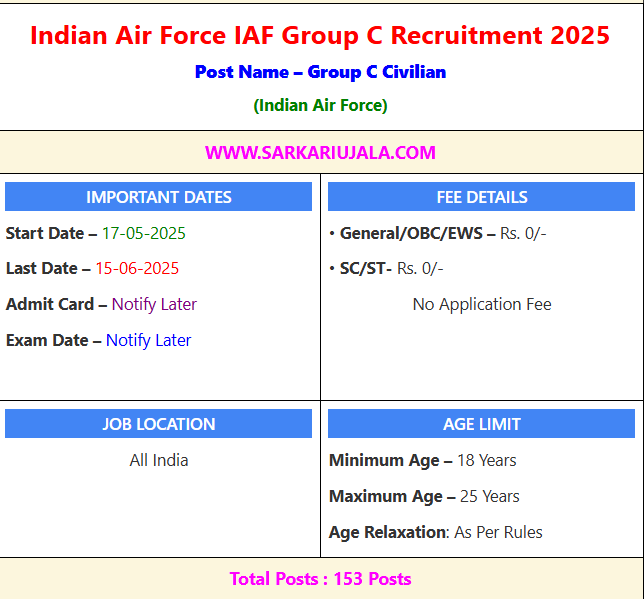 Post Description – Indian Air Force is inviting online applications for Group C Civilian for 153 posts. Interested people meet all the eligibility criteria, apply online Details Of Recruitment Of Air Force IAF Group C Offline Form 2025Posts Name – Group C Civilian Number Of Posts – 153 Posts Category Wise Posts – LDC – 14 Posts Hindi Typist- 02 Posts Cook (OG)- 12 Posts Store Keeper- 16 Posts Carpenter (SK) – 03 Posts Painter (SK)- 03 Posts Multi Tasting Staff (MTS)- 53 Posts Mess Staff- 07 Posts Laundryman- 03 Posts House Keeping Staff (HKS)- 31 Posts Vulcaniser- 01 Posts Civilian Mechanical Transport Driver- 08 Posts Educational Qualification- Lower Division Clerk (LDC) – 12th Passed And English Typing @35wpm or Hindi Typing @30wpm Hindi Typist– 12th Passed And English Typing @35wpm or Hindi Typing @30wpm Cook (OG)– 10th Passed And 1 Years Experience in Trade. Store Keeper– 12th Passed From Any Recognised Board Carpenter (SK) – 10th Passed / ITI In Related Trade. Painter (SK)– 10th Passed / ITI In Related Trade. Multi Tasting Staff (MTS)– 10th Passed Mess Staff– 10th Passed Laundryman– 10th Passed House Keeping Staff (HKS)– 10th Passed Vulcaniser– 01 Posts Civilian Mechanical Transport Driver– 08 Posts How to Apply Online Air Force IAF Group C Offline Form 2025 – Download the Air Force Group C Application Form PDF from the direct link below or from the IAF’s official website, indianairforce.nic.in. Fill out the application form as per the given format, attach the required documents, and write “APPLICATION FOR THE POST OF …………… AND CATEGORY ………………..“ on the envelope. Send the completed application form to the address of the respective Air Force Station/Unit for which you are applying. The list of station-wise vacancies can be found in the Air Force Group C Notification 2025 PDF provided below. Candidates can apply through link provided below or they can also apply through official site of the Indian Air Force before 15/June/2025. Required Documents For Online Application – 10th / 12th Mark sheet And Certificates Aadhar Card / Pan Card Passport Size Photo Signature Selection Mode – Written Exam PET/PST Skill Test Final Merit List