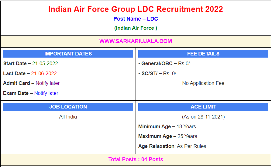 Indian Air Force Group LDC Recruitment 2022Post Name – LDC(Indian Air Force ) | |||||