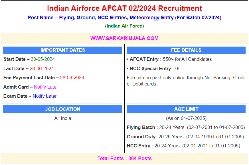 Post Description – AFCAT Indian Air Force is inviting online applications for Flying, Ground, NCC Entries 304 posts. Interested people meet all the eligibility criteria, apply online Details Of Recruitment Of Indian Airforce AFCAT 02/2024 Online FormPosts Name –Flying, Ground, NCC Entries Number Of Posts – 304 Posts Category Wise Posts – AFCAT Entry Flying- 29 Posts Ground Duty Technical Aeronautical Engineer (L) – 111 Posts Aeronautical Engineer (M) – 45 Posts Ground Duty Non Technical Weapon Systems (WS) Branch – 17 Posts Admin – 54 Posts Accts- 12 Posts Lgs- 17 Posts Edn- 09 Posts Met- 10 Posts NCC Special Entry – 10% seats out of CDSE vacancies for PC and 10% seats out of AFCAT vacancies for SSC Pay Scale – Rs. 56100- Rs.1,77,500 Rupees Education Qualification – Flying Branch – Bachelor Degree in Any Stream with Physics and Math at 10+2 Level / B.E / B.Tech Course Ground Duty Technical Branch-: Aeronautical Engineering Electronics – 12th Passed With 60% Marks in Physics and Math and Minimum 4 Year Graduation / Integrated PG Degree in Engineering / Technology Aeronautical engineering mechanical – Minimum 60% Marks Each in Physics and Mathematics at 10+2 Level and 4 Year Engineering / Technology Degree in Mechanical Engineering, Industrial Engineering, Aeronautical Engineering or Equivalent Degree Administration and Logistics – Bachelor Degree in Any Stream with at Least Minimum 60% Marks Accounts – Bachelor Degree in Commerce B.Com with at Least Minimum 60% Marks NCC Special Entry – NCC Air wing Senior Division ‘C’ certificate & other Details as per flying branch Eligibility Meteorology Entry – Bachelor Degree with Physics and Mathematics with a minimum of 60% marks OR 4 year Graduation in Engineering/Technology discipline with a minimum of 60% marks Or Equivalent Degree. How to Apply Online Indian Airforce AFCAT 02/2024 Online Form – Candidates can apply through link provided below or they can also apply through official site of the Indian Air Force before 28/June/2024. Required Documents For Online Application – Educational Mark sheet And Certificates Aadhar Card / Pan Card Passport Size Photo Signature Selection Mode – PET/PST CBT Test NCC Certificate (If Applicable) Interview Final Merit List