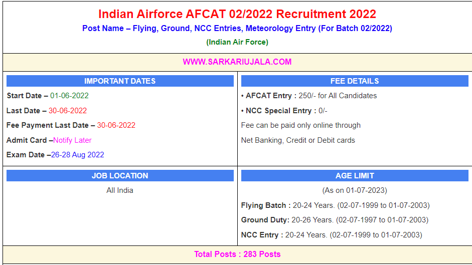IMPORTANT DATESStart Date – 01-06-2022 Last Date – 30-06-2022 Fee Payment Last Date – 30-06-2022 Admit Card –Notify Later Exam Date –26-28 Aug 2022 | FEE DETAILS• AFCAT Entry : 250/- for All Candidates • NCC Special Entry : 0/- Fee can be paid only online through Net Banking, Credit or Debit cards | ||||