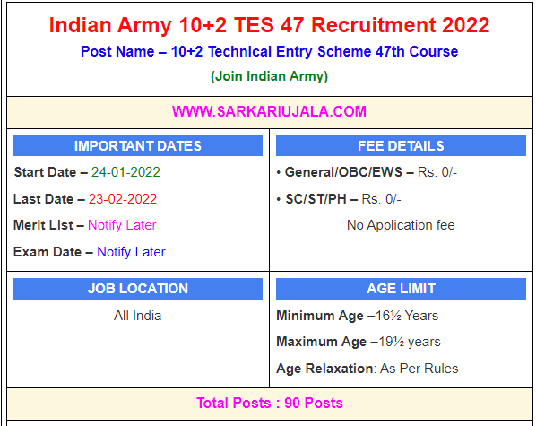 Details Of Recruitment Of Indian Army 10+2 TES 47 Online Form 2022
