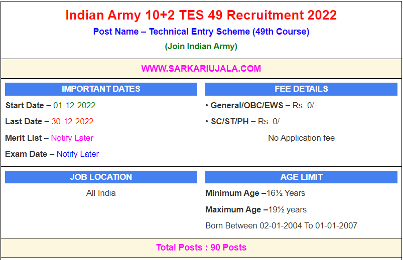 Post Description – Join Indian Army is inviting online applications for 10+2 Technical Entry Scheme 49th Course. Interested people meet all the eligibility criteria, apply online Details Of Recruitment Of Indian Army 10+2 TES 49th Online Form 2022Posts Name – 10+2 TES 49 Course Number Of Posts – 90 Posts Pay Scale – As Per Rules Education Qualification – 10+2 Passed with 60% Marks in PCM and appeared in JEE (Mains) 2022 How to Apply Online Indian Army 10+2 TES 49th Online Form 2022 – Candidates can apply through link provided below or they can also apply through official site of the Join Indian Army before 30/December/2022. Required Documents For Online Application – 10th / 12th Mark sheet And Certificates JEEMAIN 2022 Marks Aadhar Card / Pan Card Passport Size Photo Signature Selection Mode – Shortlist SSB Interview