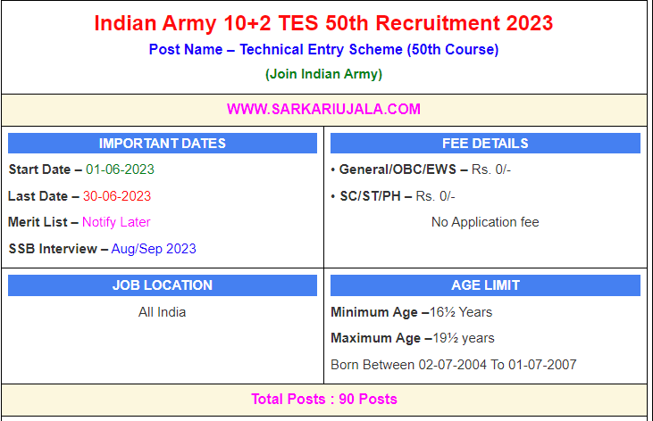 Post Description – Join Indian Army is inviting online applications for 10+2 Technical Entry Scheme 50th Course. Interested people meet all the eligibility criteria, apply online Details Of Recruitment Of Indian Army 10+2 TES 50th Online Form 2023Posts Name – 10+2 TES 50 Course Number Of Posts – 90 Posts Pay Scale – As Per Rules Education Qualification – 10+2 Passed with 60% Marks in PCM and appeared in JEE (Mains) 2023 How to Apply Online Indian Army 10+2 TES 50th Online Form 2023 – Candidates can apply through link provided below or they can also apply through official site of the Join Indian Army before 30/June/2023. Required Documents For Online Application – 10th / 12th Mark sheet And Certificates JEEMAIN 2023 Marks Aadhar Card / Pan Card Passport Size Photo Signature Selection Mode – Shortlist SSB Interview