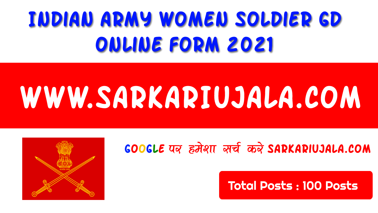 Post Description –Join Indian Army is inviting online applications for Women Military Police for 100 posts. Interested people meet all the eligibility criteria, apply online Rally Vanue – Ambala, Lucknow, Jabalpur, Bangalore, Shillong & Pune Details Of Recruitment Of Indian Army Women Soldier GD Online Form 2021Posts Name – Women Military Police Number Of Posts – 100 Posts Pay Scale – As Per Rules Education Qualification – 10th Passed with 45% marks in aggregate and minimum 33% marks in each subject. Physical Standard Height: 152 cm Running- 1600 Meter in 7 Minute 30 Second (Group I) , 8 Minute (Group II) High Jump – 3 feet Long Jump – 10 feet How to Apply Online Indian Army Women Soldier GD Online Form 2021 – Candidates can apply through link provided below or they can also apply through official site of the Join Indian Army before 20/july/2021. Required Documents For Online Application – 10th Mark sheet And Certificates Aadhar Card / Pan Card Passport Size Photo Signature Selection Mode – Written Examination PET PST Medical Final Merit List