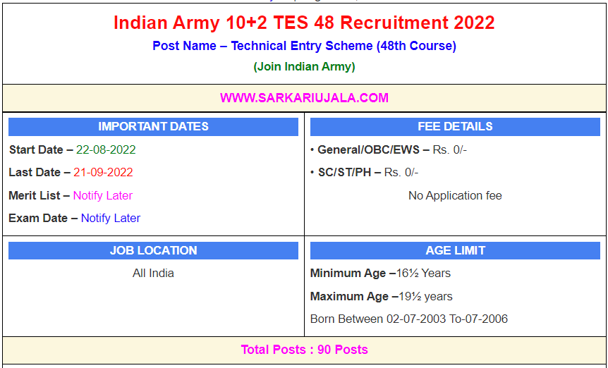 Post Description –Join Indian Army is inviting online applications for 10+2 Technical Entry Scheme 48th Course for 90 posts. Interested people meet all the eligibility criteria, apply online Details Of Recruitment Of Indian Army 10+2 TES 48th Online Form 2022Posts Name – 10+2 TES 48 Course Number Of Posts – 90 Posts Pay Scale – As Per Rules Education Qualification – 12th Pass with 60% Marks in PCM and appeared in JEE (Mains) 2022 How to Apply Online Indian Army 10+2 TES 48th Online Form 2022 – Candidates can apply through link provided below or they can also apply through official site of the Join Indian Army before 21/Sep/2022. Required Documents For Online Application – 10th / 12th Mark sheet And Certificates JEEMAIN Marks Aadhar Card / Pan Card Passport Size Photo Signature Selection Mode – Shortlist SSB Interview