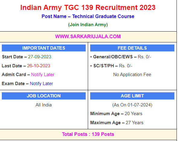 Post Description – Join Indian Army is inviting online applications for Technical Graduate Courses TGC For 139 posts. Interested people meet all the eligibility criteria, apply online Details Of Recruitment Of Indian Army TGC 139 Online Form 2023Posts Name – Technical Graduate Courses TGC Number Of Posts – 40 Posts Category Wise Posts – Civil / Building Construction Technology – 07 Posts Computer Science & Engineering / Computer Technology/ Info Tech/ M. Sc Computer Science – 07 Posts Mechanical / Production / Automobile / Equivalent – 07 Posts Electrical / Electrical & Electronics- 03 Posts Electronics & Telecom/ Telecommunication/ Satellite Communication- 04 Posts Misc. Engineering Stream – 02 Posts Pay Scale – Rs. 56,100/- Rs.2,50,000/- Education Qualification – Passed / Appearing Engineering Degree in Related Trade / Branch Or Final Year Appearing Candidate are also Eligible How to Apply Online Indian Army TGC 139 Online Form 2023 – Candidates can apply through link provided below or they can also apply through official site of the Join Indian Army before 26/October/2023. Required Documents For Online Application – Educational Mark sheet And Certificates Aadhar Card / Pan Card Passport Size Photo Signature Selection Mode – Written Examination PET/PST SSB Interview Final Merit List