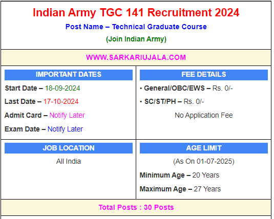 Post Description – Join Indian Army is inviting online applications for Technical Graduate Courses TGC For 30 posts. Interested people meet all the eligibility criteria, apply online Details Of Recruitment Of Indian Army TGC 141 Online Form 2024Posts Name – Technical Graduate Courses TGC Number Of Posts – 30 Posts Category Wise Posts – Civil / Building Construction Technology – 08 Posts Computer Science & Engineering / Computer Technology/ Info Tech/ M. Sc Computer Science – 06 Posts Mechanical / Production / Automobile / Equivalent – 06 Posts Electrical / Electrical & Electronics- 02 Posts Electronics & Telecom/ Telecommunication/ Satellite Communication- 06 Posts Misc. Engineering Stream – 02 Posts Pay Scale – Rs. 56,100/- Rs.2,50,000/- Education Qualification – Passed / Appearing Engineering Degree in Related Trade / Branch Or Final Year Appearing Candidate are also Eligible How to Apply Online Indian Army TGC 141 Online Form 2024 – Candidates can apply through link provided below or they can also apply through official site of the Join Indian Army before 17/October/2024. Required Documents For Online Application – Educational Mark sheet And Certificates Aadhar Card / Pan Card Passport Size Photo Signature Selection Mode – Written Examination PET/PST SSB Interview Final Merit List