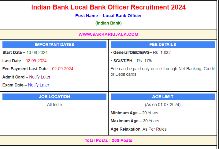 Post Description – Indian Bank is inviting online applications for Local Bank Officer for 300 posts. Interested people meet all the eligibility criteria, apply online Details Of Recruitment Of Indian Bank Local Bank Officer Online Form 2024Posts Name – Local Bank Officer (Scale-1) State Wise Posts – Tamil Nadu/ Poducherry- 160 Posts Karnatka- 35 Posts Andhra Pradesh & Telangana- 50 Posts Maharashtra- 40 Posts Gujarat- 15 Posts Category Wise Posts – UR- 127 Posts OBC- 79 Posts EWS- 29 Posts SC- 44 Posts ST- 21 Posts Number Of Posts – 300 Posts Stipend – Rs. 48480/- To 85920 (Scale -1) Education Qualification – Bachelor Degree in in any discipline from a recognized University. How to Apply Online Indian Bank Local Bank Officer Online Form 2024 – Candidates can apply through link provided below or they can also apply through official site of the Indian Bank before 02 September 2024. Required Documents For Online Application – Educational Mark sheet And Certificates Aadhar Card / Pan Card Passport Size Photo Signature Selection Mode – CBT Exam Merit List