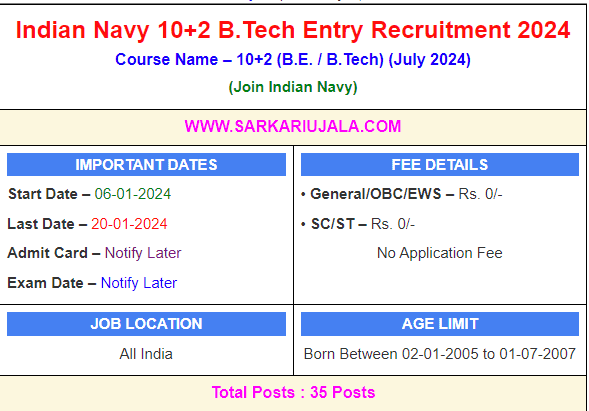 Post Description – Join Indian Navy is inviting online applications for 10+2 B.E. / B.Tech (July 2024 Batch) for 35 posts. Interested people meet all the eligibility criteria, apply online Details Of Recruitment Of Indian Navy 10+2 B.Tech Entry (July 2024) Online FormPosts Name – B.E. / B.Tech (July 2024) Number Of Posts – 35 Posts Category Wise Posts – Executive & Technical Post – 35 posts Education Qualification – 10+2 Passed from any Board with 70% marks in Physics, Chemistry, Math in Each Subject. And 50% Marks in English And Candidates Must be Enrolled and Appeared in JEEMAIN 2023 Entrance Examination. How to Apply Online Indian Navy 10+2 B.Tech Entry Online Form 2024 – Candidates can apply through link provided below or they can also apply through official site of the Join Indian Navy before 20/January/2024. Required Documents For Online Application – 10th / 12th Mark sheet And Certificates Aadhar Card / Pan Card Passport Size Photo Signature Selection Mode – Short List SSB Interview Final Merit List