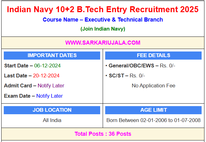 Indian Navy 10+2 B.Tech Entry Recruitment 2025Course Name – Executive & Technical Branch(Join Indian Navy) | |||||