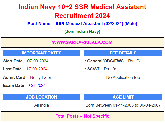 Post Description – Join Indian Navy is inviting online applications For SSR Medical Assistant posts. Interested people meet all the eligibility criteria, apply online Details Of Recruitment Of Indian Navy 10+2 SSR Medical Assistant Online Form 2024Posts Name – SSR Medical Assistant Number Of Posts – Not Specific Pay Scale – ₹ 47,600/- To ₹ 1,51,100/- Plus MSP @ ₹ 5200/- per month Education Qualification – 10+2 with Physics, Chemistry, Biology (PCB) from Any Recognized Board in India with 50% Marks. And 40% Marks in Each Subjects How to Apply Online Indian Navy 10+2 SSR Medical Assistant Online Form 2024 – Candidates can apply through link provided below or they can also apply through official site of the Join Indian Navy before 17/September/2024. Required Documents For Online Application – 10th / 12th Mark sheet And Certificates Aadhar Card / Pan Card Passport Size Photo Signature Selection Mode – Shortlist CBT Exam PET/PST Merit List